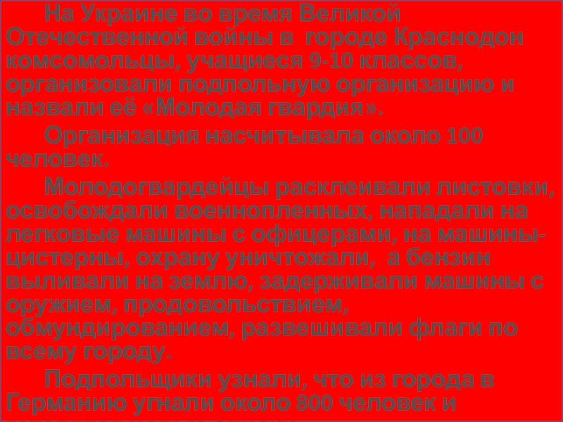 в городе Краснодон комсомольцы, учащиеся 9-10 классов, организовали подпольную организацию и назвали её «Молодая гвардия».