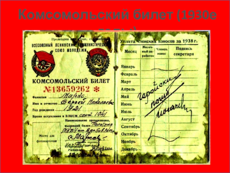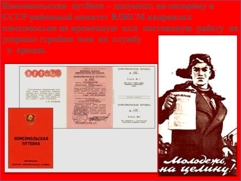 Слайд 18Комсомольская путёвка – документ, по которому в СССР районный комитет ВЛКСМ