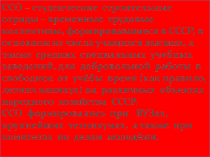 Слайд 17ССО – студенческие строительные отряды – временные трудовые коллективы, формировавшиеся в