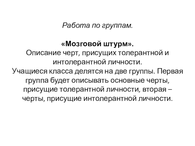 класса делятся на две группы. Первая группа будет описывать основные черты, присущие толерантной личности, вторая – черты, присущие интолерантной личности.