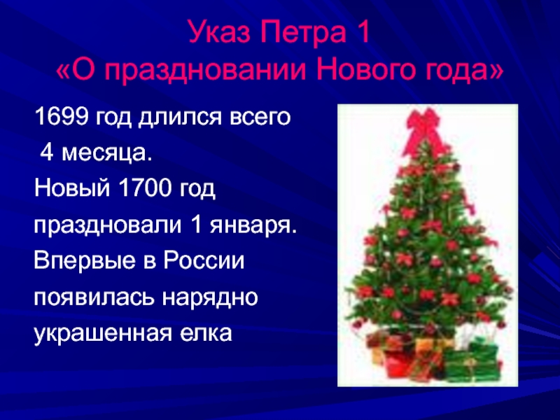 Указ Петра 1  «О праздновании Нового года» 1699 год длился всего 4 месяца.Новый 1700 год праздновали