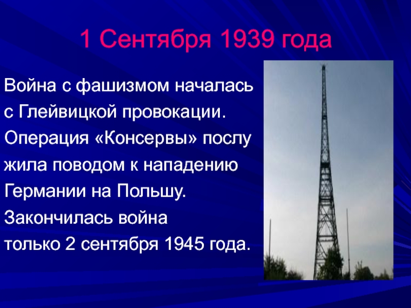 1 Сентября 1939 годаВойна с фашизмом началась с Глейвицкой провокации. Операция «Консервы» послужила поводом к нападению Германии