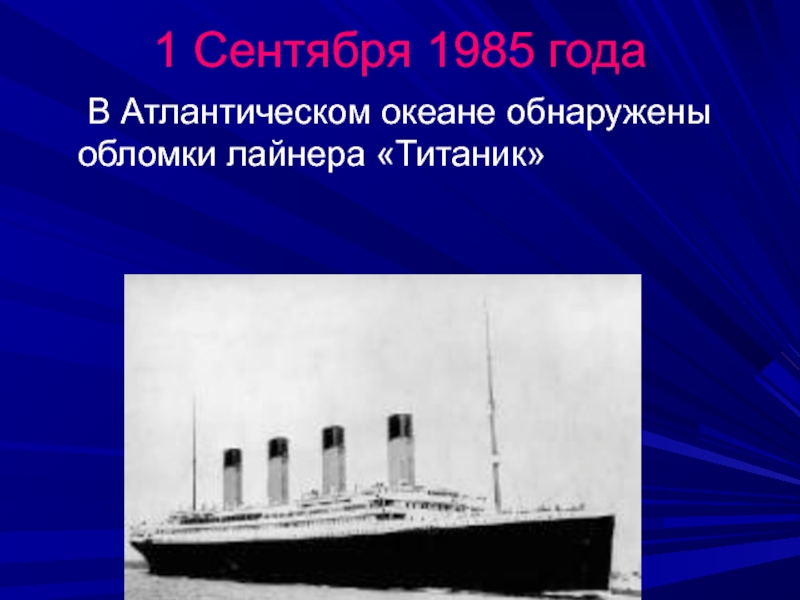 1 Сентября 1985 года  В Атлантическом океане обнаружены	  обломки лайнера «Титаник»