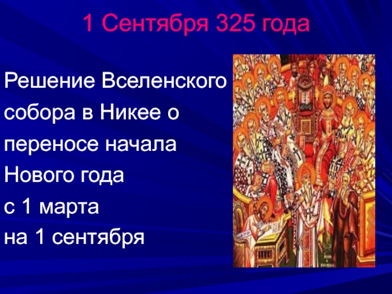 1 Сентября 325 годаРешение Вселенского собора в Никее о переносе начала Нового годас 1 марта на 1