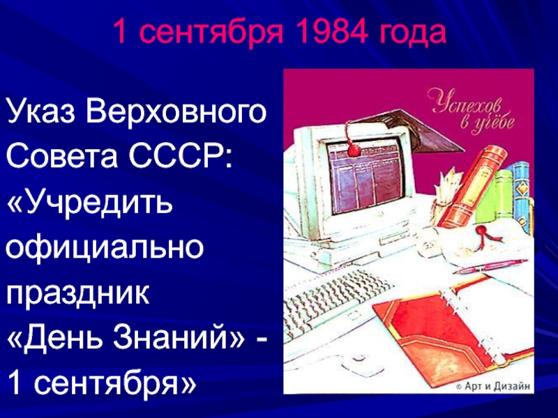 1 сентября 1984 годаУказ Верховного Совета СССР:«Учредить официально праздник«День Знаний» - 1 сентября»