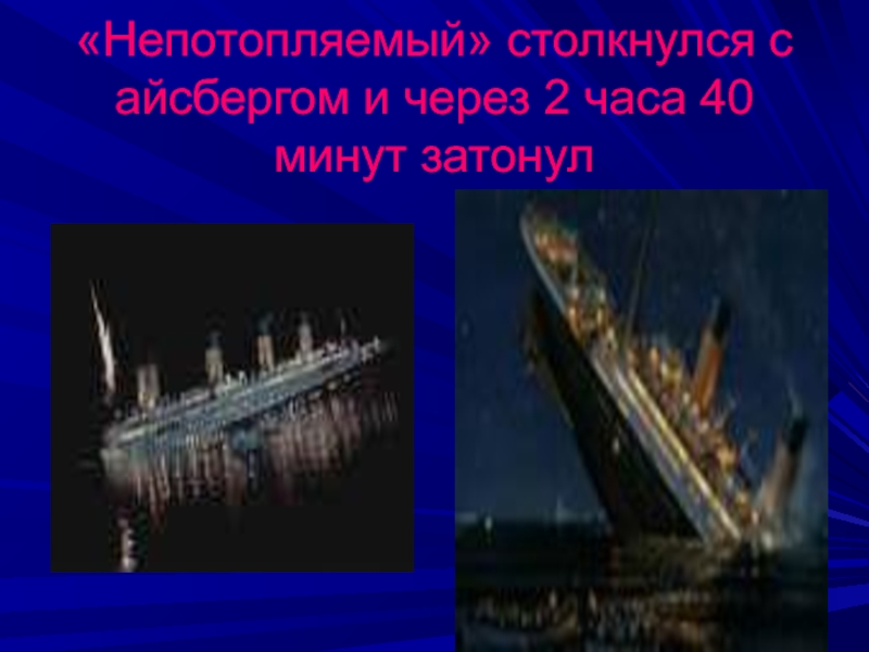 Слайд 15 «Непотопляемый» столкнулся с айсбергом и через 2 часа 40 минут затонул