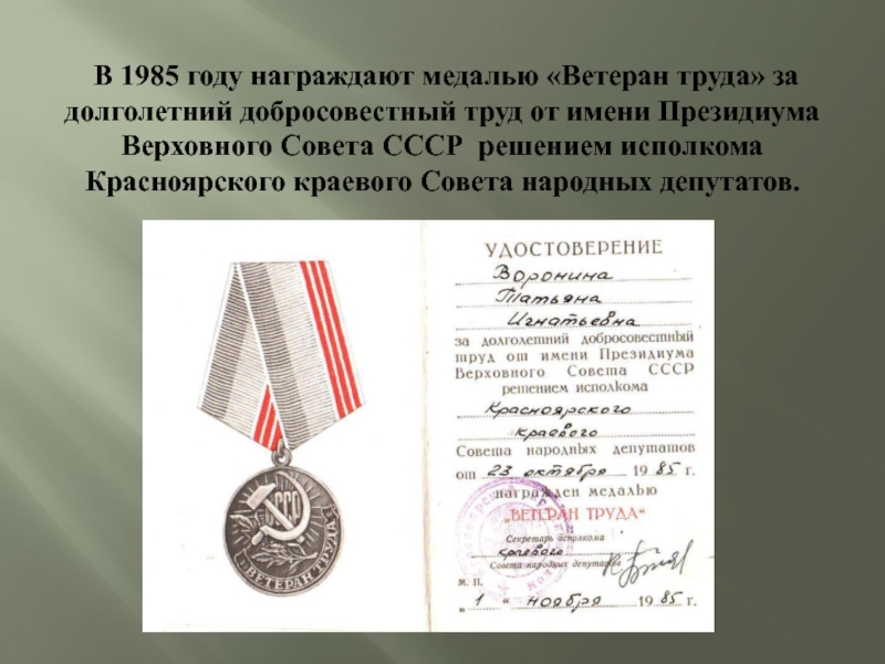 Слайд 10 В 1985 году награждают медалью «Ветеран труда» за долголетний добросовестный