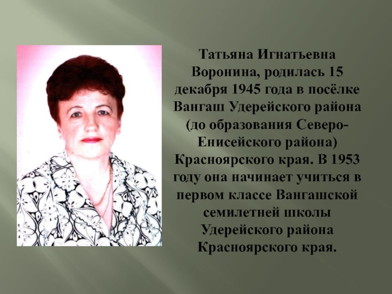 Слайд 6Татьяна Игнатьевна Воронина, родилась 15 декабря 1945 года в посёлке Вангаш