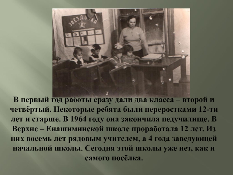 четвёртый. Некоторые ребята были переростками 12-ти лет и старше. В 1964 году она закончила педучилище. В Верхне – Енашиминской школе проработала 12 лет. Из них восемь лет рядовым учителем, а 4 года заведующей начальной школы. Сегодня этой школы уже нет, как и самого посёлка.