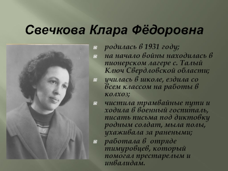работала в отряде тимуровцев, который помогал престарелым и инвалидам.