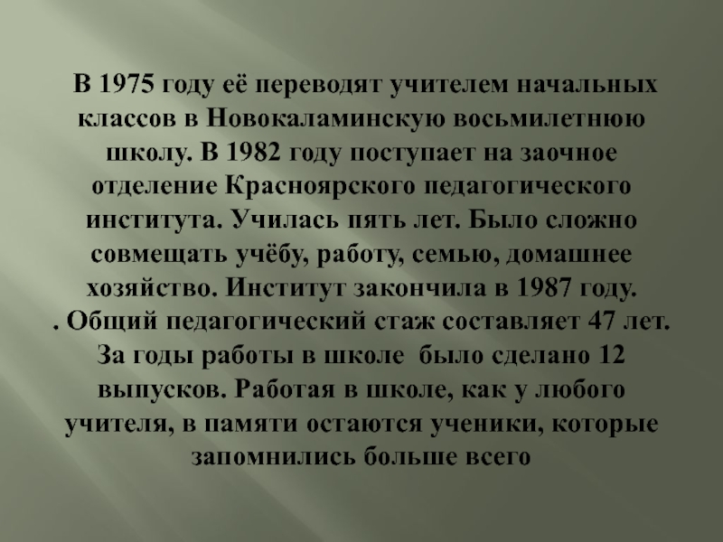 Слайд 9 В 1975 году её переводят учителем начальных классов в Новокаламинскую