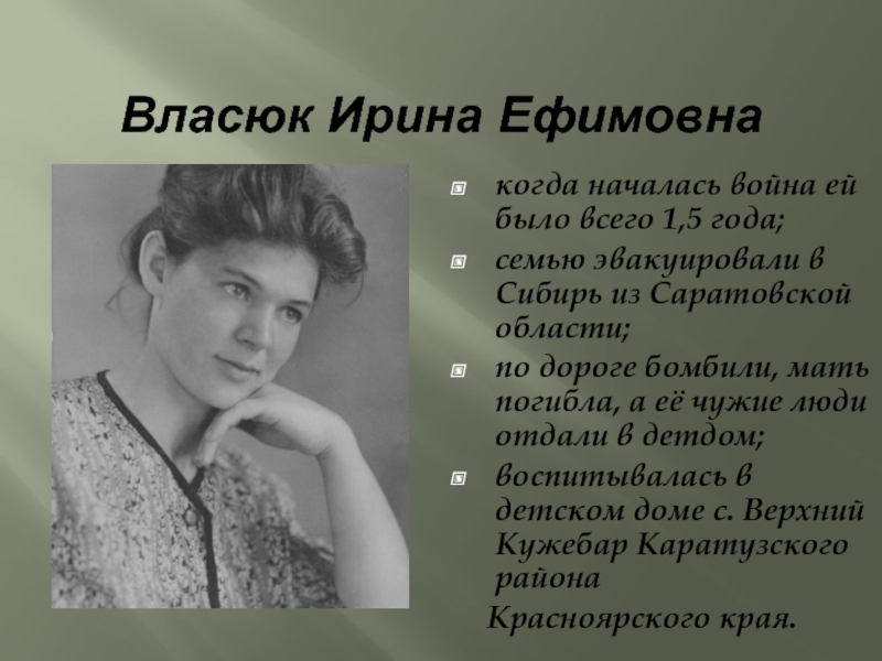 воспитывалась в детском доме с. Верхний Кужебар Каратузского района