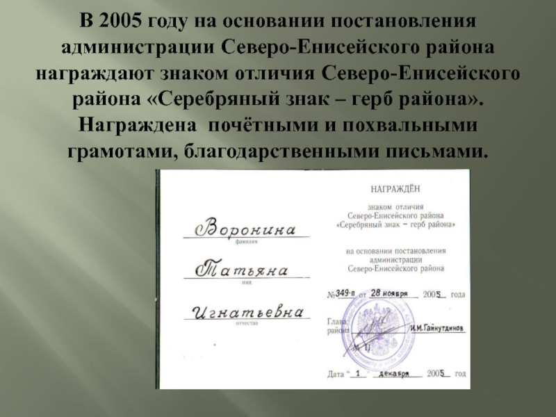 Слайд 11В 2005 году на основании постановления администрации Северо-Енисейского района награждают знаком