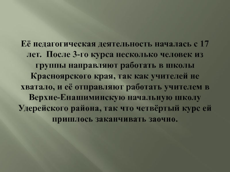 человек из группы направляют работать в школы Красноярского края, так как учителей не хватало, и её отправляют работать учителем в Верхне-Енашиминскую начальную школу Удерейского района, так что четвёртый курс ей пришлось заканчивать заочно.