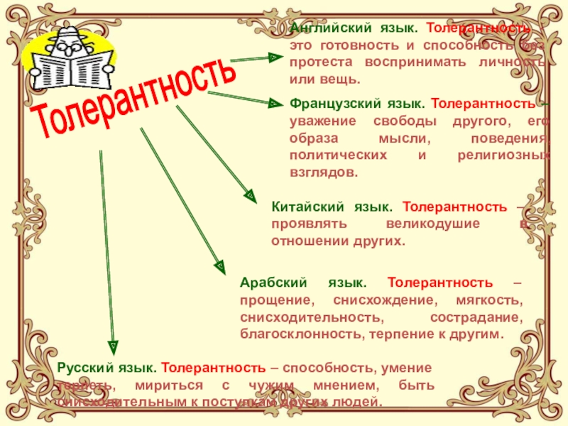 Русский язык. Толерантность – способность, умение терпеть, мириться с чужим мнением, быть снисходительным к поступкам других людей.