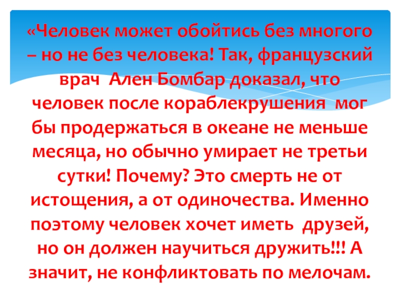 французский врач Ален Бомбар доказал, что человек после кораблекрушения мог бы продержаться в океане не меньше месяца, но обычно умирает не третьи сутки! Почему? Это смерть не от истощения, а от одиночества. Именно поэтому человек хочет иметь друзей, но он должен научиться дружить!!! А значит, не конфликтовать по мелочам.