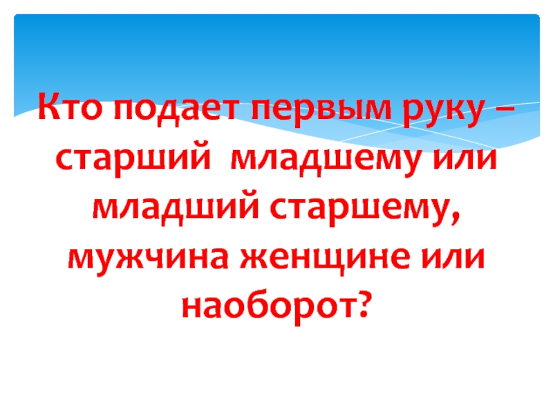 Слайд 13Кто подает первым руку – старший младшему или младший старшему, мужчина