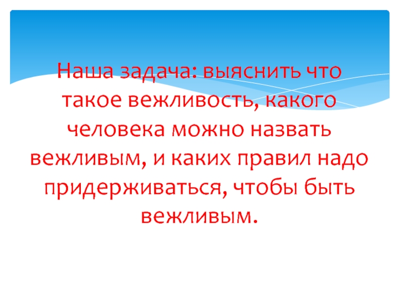 Слайд 4Наша задача: выяснить что такое вежливость, какого человека можно назвать вежливым,