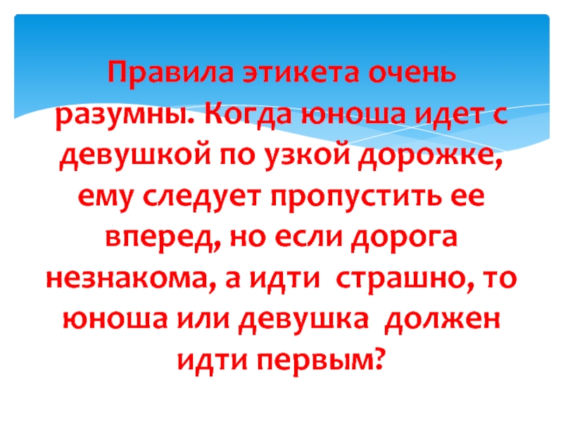 Слайд 16Правила этикета очень разумны. Когда юноша идет с девушкой по узкой