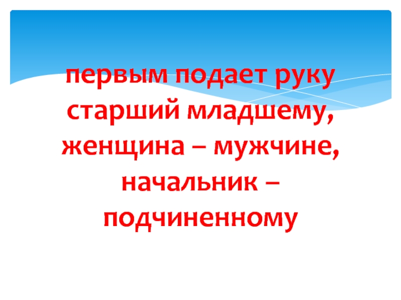 Слайд 14первым подает руку старший младшему, женщина – мужчине, начальник – подчиненному