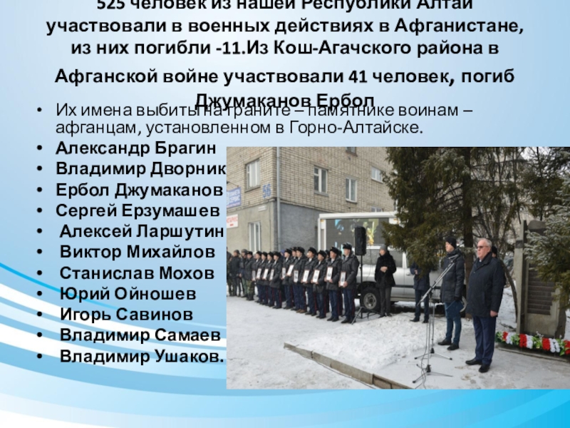 Их имена выбиты на граните – памятнике воинам – афганцам, установленном в Горно-Алтайске.