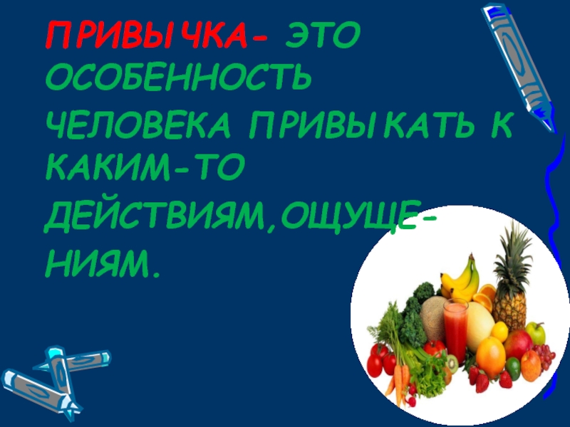 ПРИВЫЧКА- ЭТО ОСОБЕННОСТЬ ЧЕЛОВЕКА ПРИВЫКАТЬ К КАКИМ-ТО ДЕЙСТВИЯМ,ОЩУЩЕ-НИЯМ.