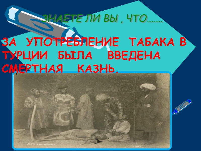 ЗНАЕТЕ ЛИ ВЫ, ЧТО……. ЗА УПОТРЕБЛЕНИЕ ТАБАКА В ТУРЦИИ БЫЛА  ВВЕДЕНА СМЕРТНАЯ  КАЗНЬ.