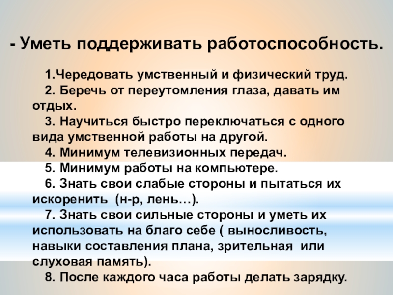 побуждать к рациональной организации своего времени и сил; к овладению, собственными эмоциями; к саморазвитию и самосовершенствованию