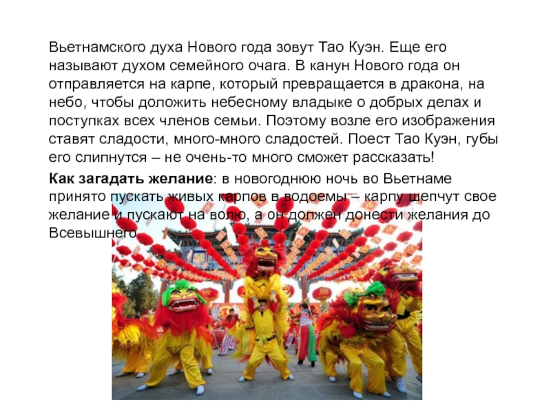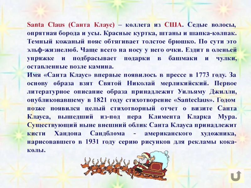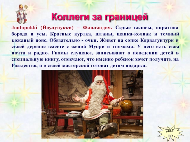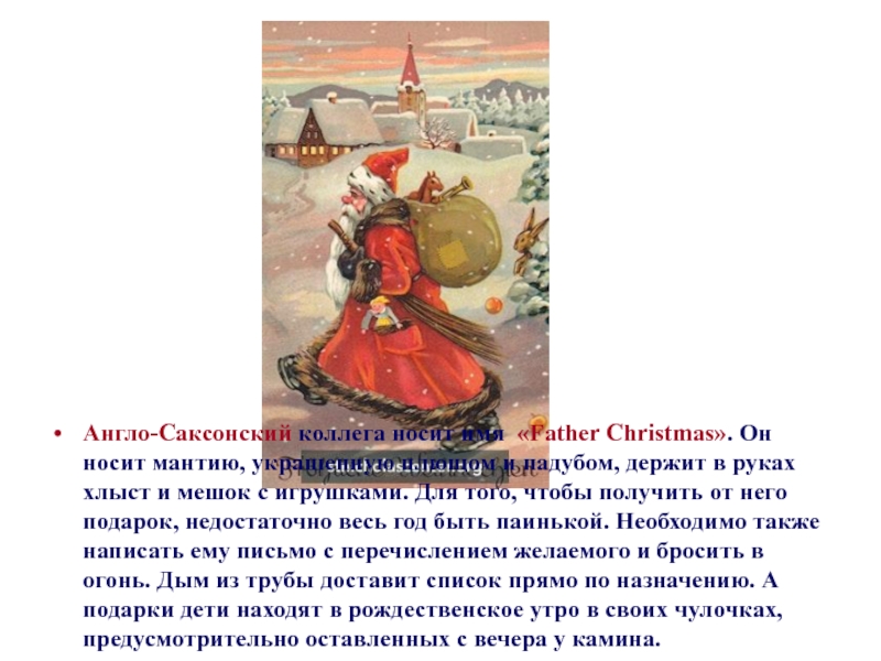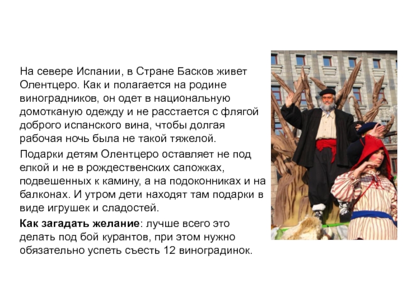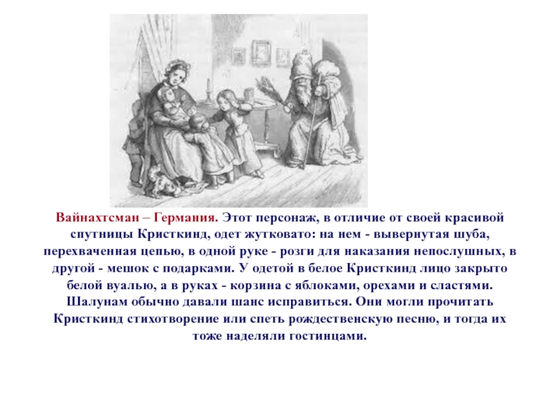 Сейчас он значительно подобрел и обычно ограничивается хождением по гостям под Новый Год и распределением подарков. Правда, иногда требует, чтобы получатель предварительно спел ему песенку или рассказал стишок.