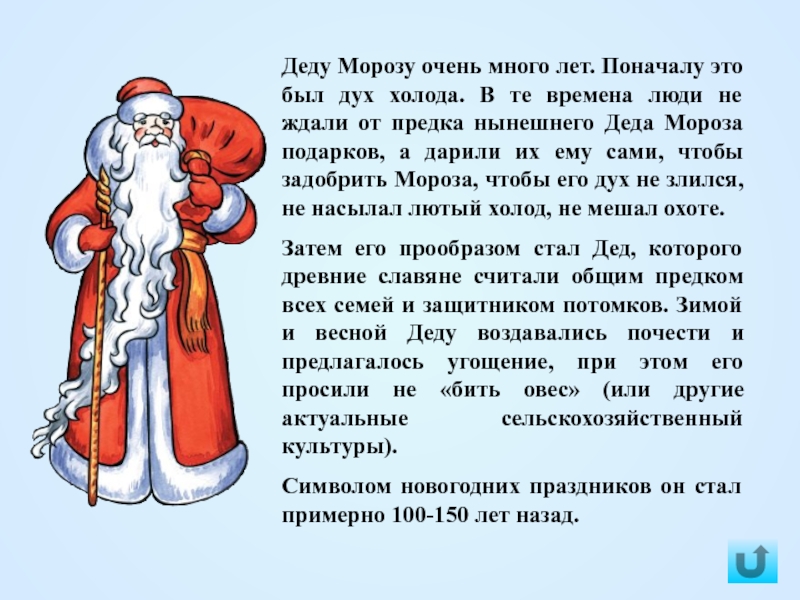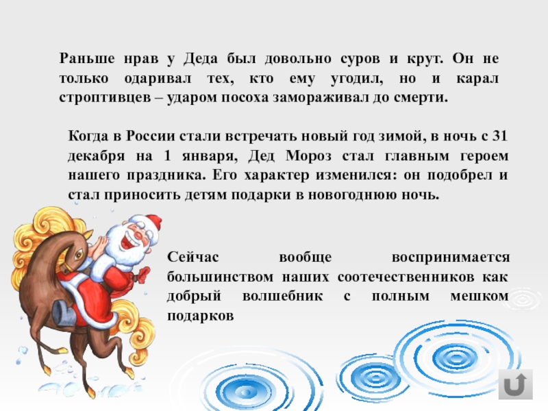 Когда в России стали встречать новый год зимой, в ночь с 31 декабря на 1 января, Дед Мороз стал главным героем нашего праздника. Его характер изменился: он подобрел и стал приносить детям подарки в новогоднюю ночь.