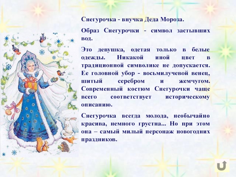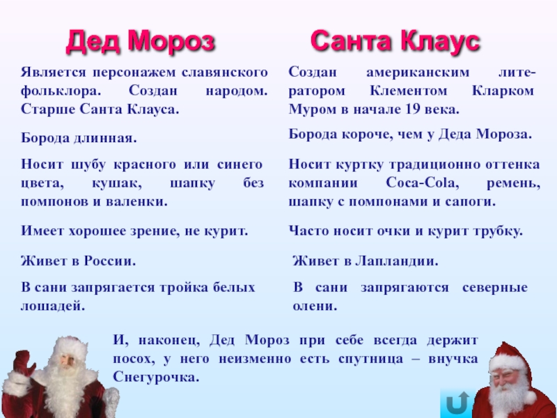 И, наконец, Дед Мороз при себе всегда держит посох, у него неизменно есть спутница – внучка Снегурочка.