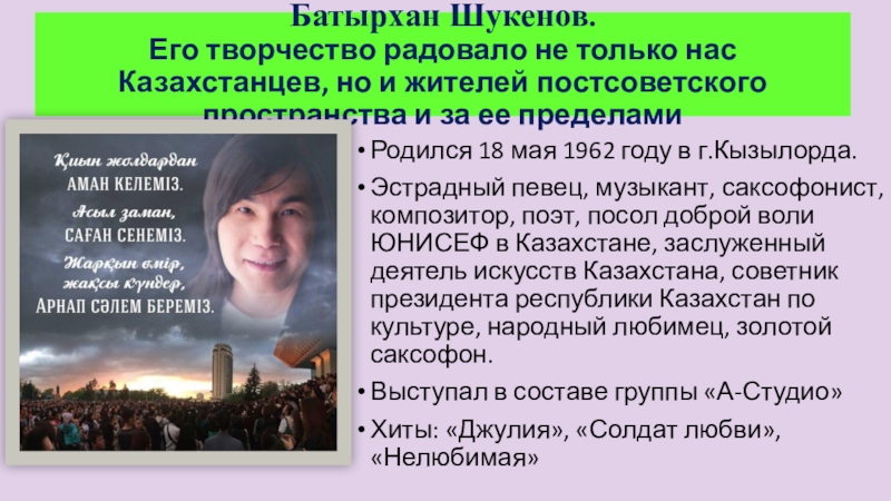 Эстрадный певец, музыкант, саксофонист, композитор, поэт, посол доброй воли ЮНИСЕФ в Казахстане, заслуженный деятель искусств Казахстана, советник президента республики Казахстан по культуре, народный любимец, золотой саксофон.