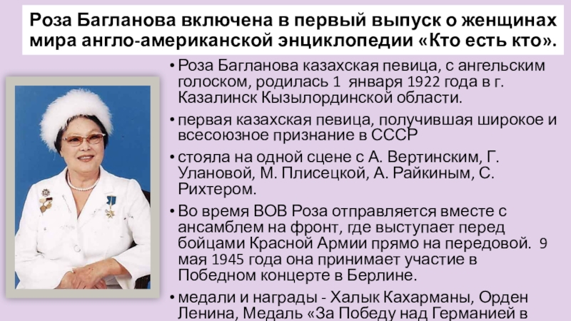 Роза Багланова казахская певица, с ангельским голоском, родилась 1 января 1922 года в г. Казалинск Кызылординской области.