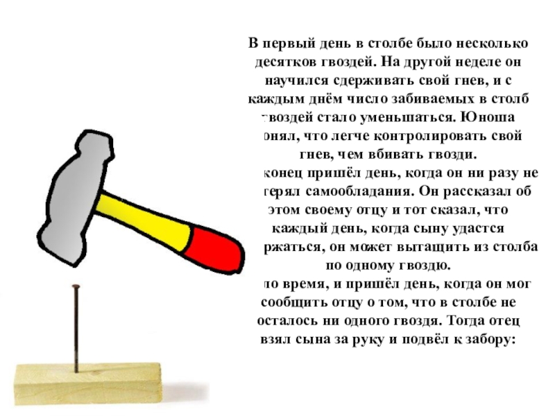 другой неделе он научился сдерживать свой гнев, и с каждым днём число забиваемых в столб гвоздей стало уменьшаться. Юноша понял, что легче контролировать свой гнев, чем вбивать гвозди.