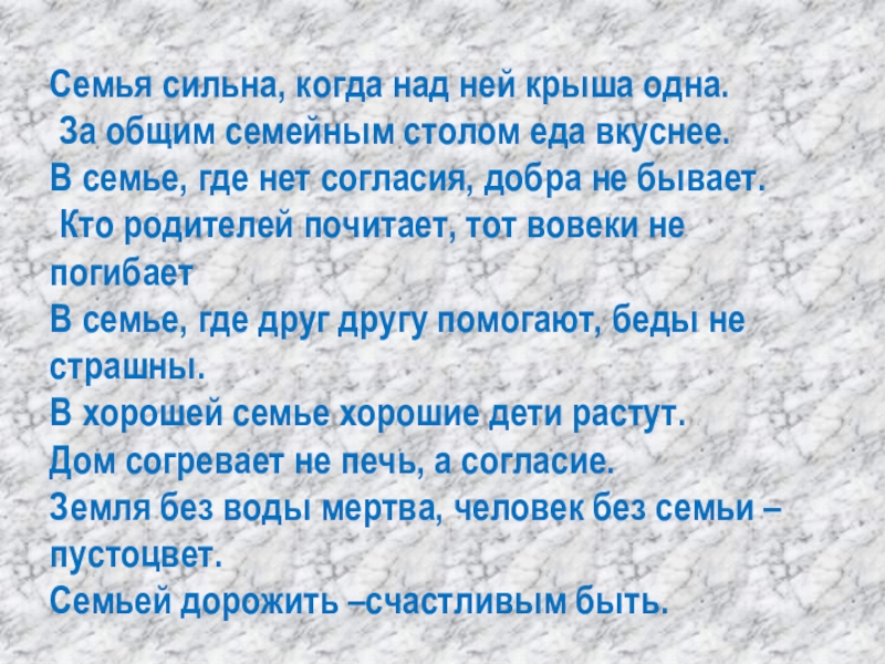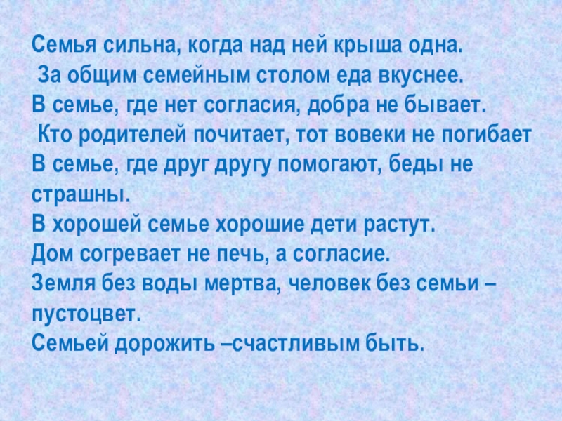 Семья сильна, когда над ней крыша одна.  За общим семейным столом еда вкуснее.В семье, где