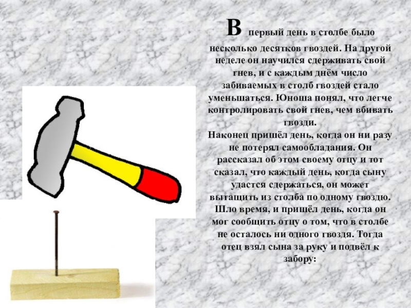 вот однажды его отец дал ему мешочек с гвоздями и наказал каждый раз, когда он не сдержит своего гнева, вбить один гвоздь в столб забора.