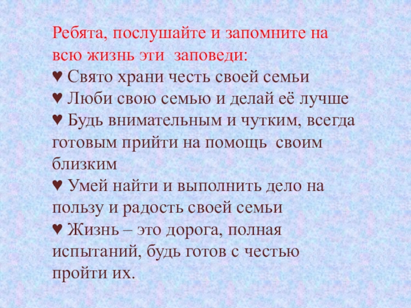 Ребята, послушайте и запомните на всю жизнь эти заповеди: ♥ Свято храни честь своей семьи