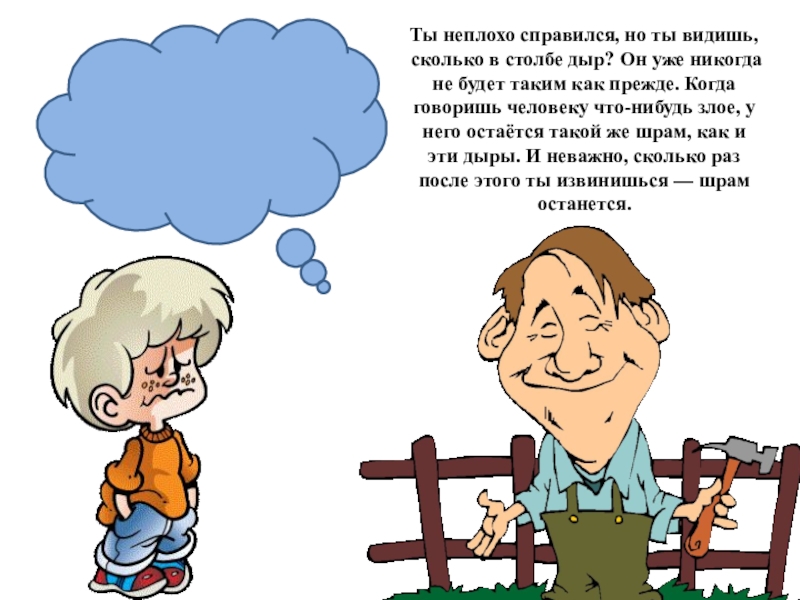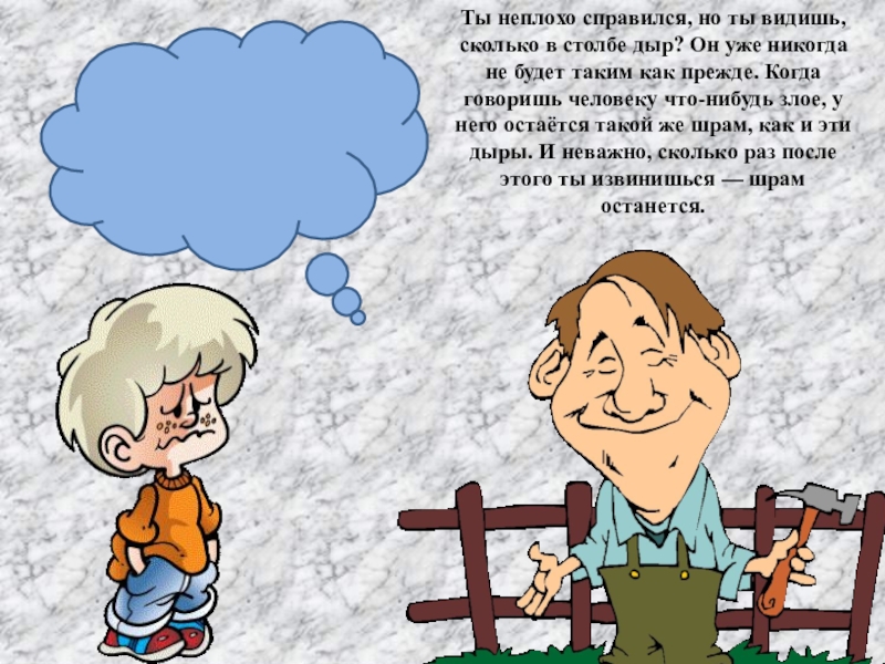 столбе дыр? Он уже никогда не будет таким как прежде. Когда говоришь человеку что-нибудь злое, у него остаётся такой же шрам, как и эти дыры. И неважно, сколько раз после этого ты извинишься — шрам останется.
