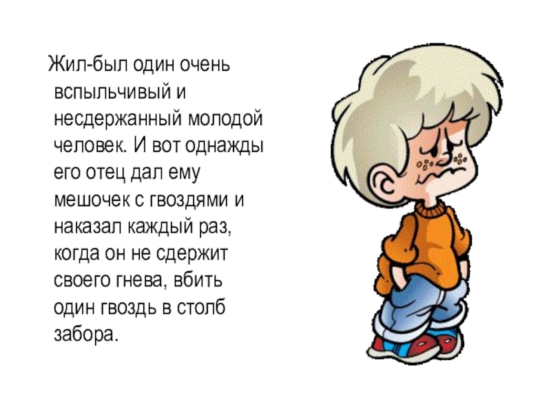 Слайд 14 Жил-был один очень вспыльчивый и несдержанный молодой человек. И