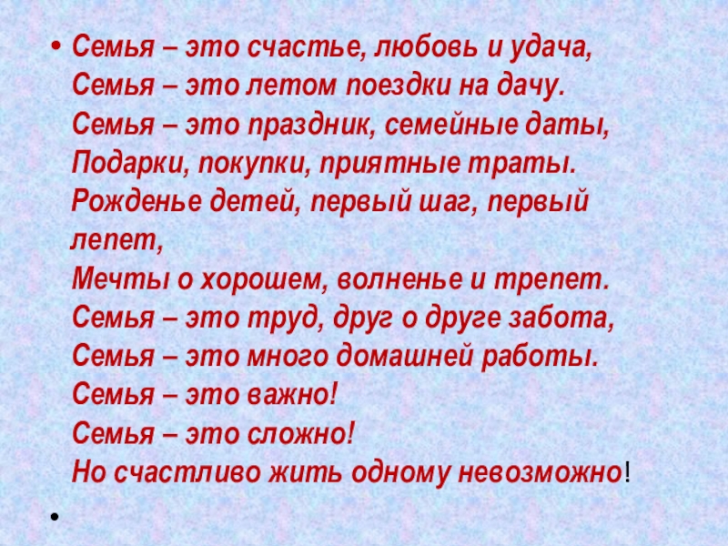 на дачу. Семья – это праздник, семейные даты, Подарки, покупки, приятные траты. Рожденье детей, первый шаг, первый лепет, Мечты о хорошем, волненье и трепет. Семья – это труд, друг о друге забота, Семья – это много домашней работы. Семья – это важно! Семья – это сложно! Но счастливо жить одному невозможно!