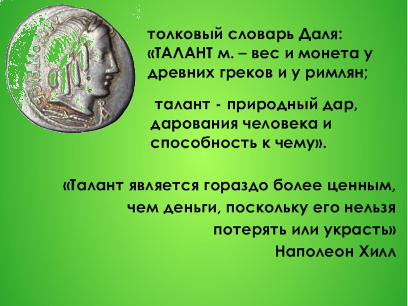 толковый словарь Даля: «ТАЛАНТ м. – вес и монета у древних греков и у римлян;