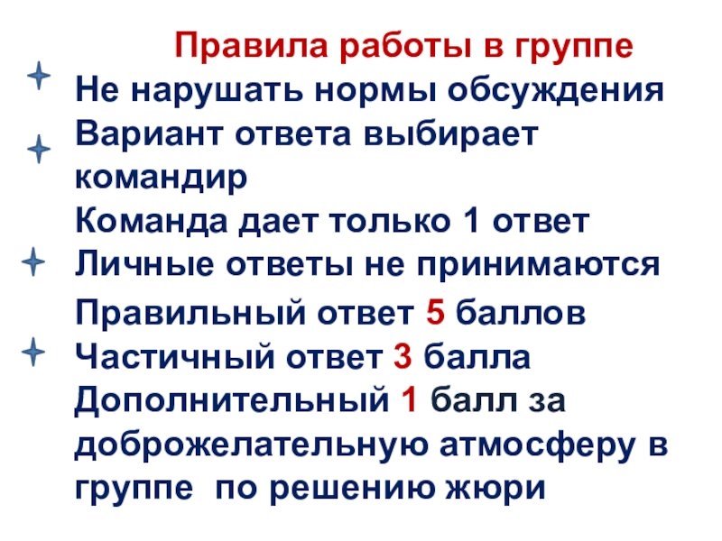 Дополнительный 1 балл за доброжелательную атмосферу в группе по решению жюри