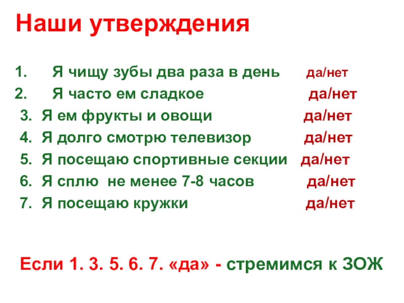 Если 1. 3. 5. 6. 7. «да» - стремимся к ЗОЖ