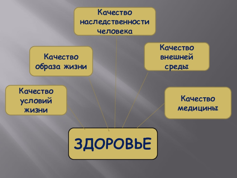 ЗДОРОВЬЕКачество условий жизниКачество образа жизниКачество наследственности человекаКачество внешней средыКачество медицины