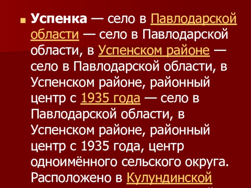 Слайд 3Успенка — село в Павлодарской области — село в Павлодарской области, в Успенском