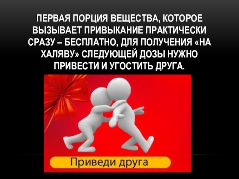 Слайд 4Первая порция вещества, которое вызывает привыкание практически сразу – бесплатно, для