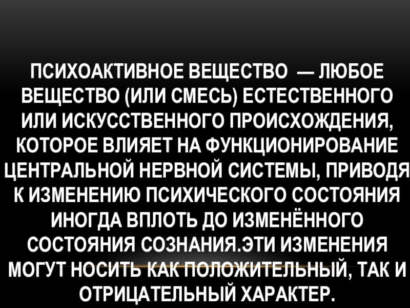 Психоактивное вещество — любое вещество (или смесь) естественного или искусственного происхождения, которое влияет на функционирование центральной нервной системы,