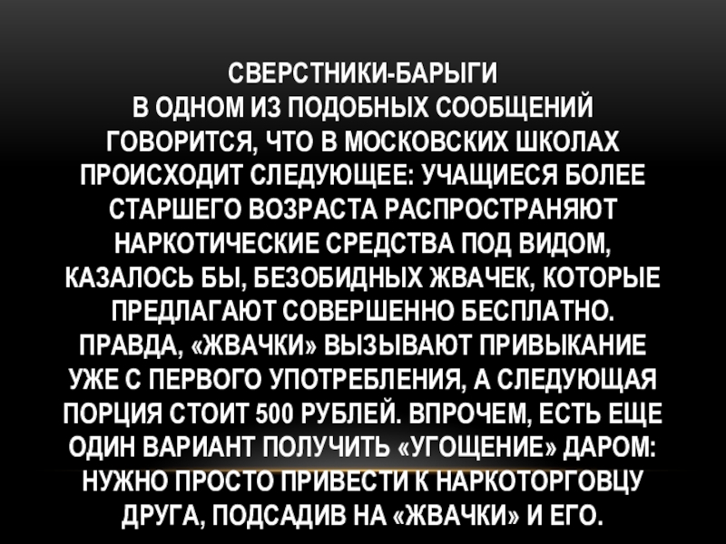 Слайд 5Сверстники-барыги В одном из подобных сообщений говорится, что в московских школах происходит