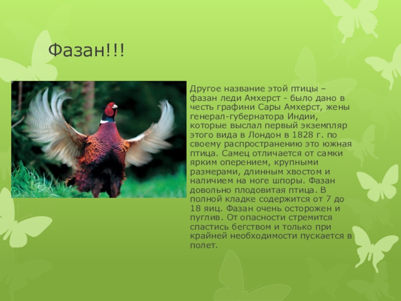 в честь графини Сары Амхерст, жены генерал-губернатора Индии, которые выслал первый экземпляр этого вида в Лондон в 1828 г. по своему распространению это южная птица. Самец отличается от самки ярким оперением, крупными размерами, длинным хвостом и наличием на ноге шпоры. Фазан довольно плодовитая птица. В полной кладке содержится от 7 до 18 яиц. Фазан очень осторожен и пуглив. От опасности стремится спастись бегством и только при крайней необходимости пускается в полет.