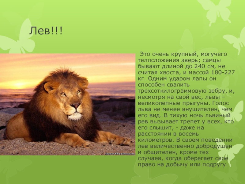 240 см, не считая хвоста, и массой 180-227 кг. Одним ударом лапы он способен свалить трехсоткилограммовую зебру, и, несмотря на свой вес, львы – великолепные прыгуны. Голос льва не менее внушителен, чем его вид. В тихую ночь львиный рев вызывает трепет у всех, кто его слышит, - даже на расстоянии в восемь километров. В своем поведении лев величественно добродушен и общителен, кроме тех случаев, когда оберегает свое право на добычу или подругу.
